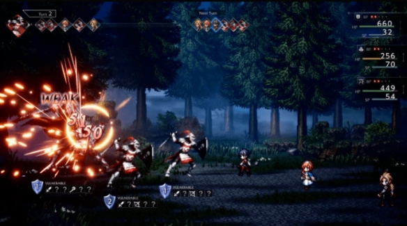 歧路旅人0在战斗的时候需要玩家手动进行,这是一款回合制游戏,玩家需要手动控制角色行动,点击攻击按钮后开始回合,然后通过技能、策略调整队伍位置,绝大部分的技能都是需要自行控制的,但也有一些技能是可以自动剩下的,比如治疗或者击破 触发的效果。