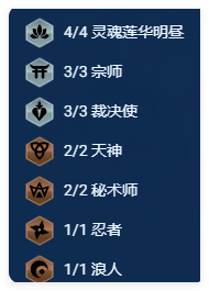 4明昼、3宗师、4裁决使、2天神、2秘术师、1忍者、1浪人