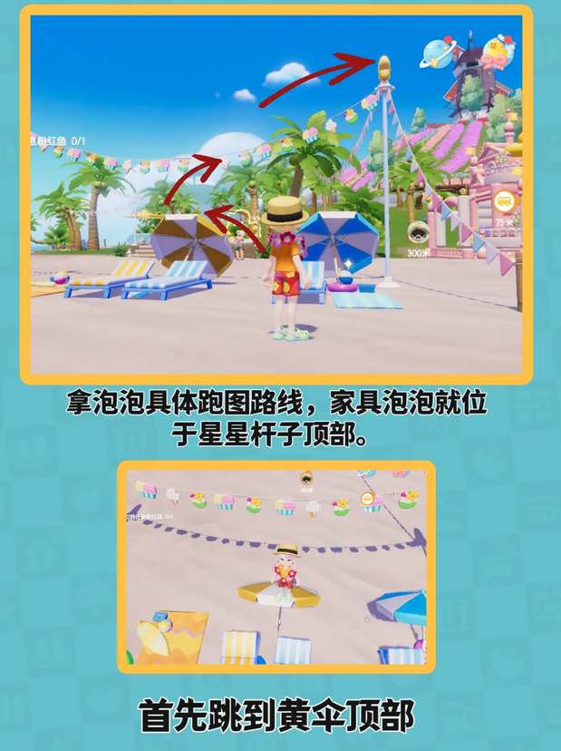 首先跳到黄伞顶部,再由黄伞顶部跳到绳子上,最后由绳子跳到星星杆上,此时泡泡就在头顶,向上跳一下就可以拿到。