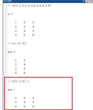 2、通过a([1 3 4],:)提取矩阵的第1,3,4行,可按需要提取不连续的几行,如图所示: