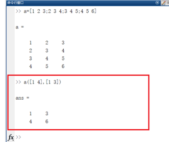 3、也可以通过a([1 4],[1 3])格式提取想要的矩阵元素,如下图所示: